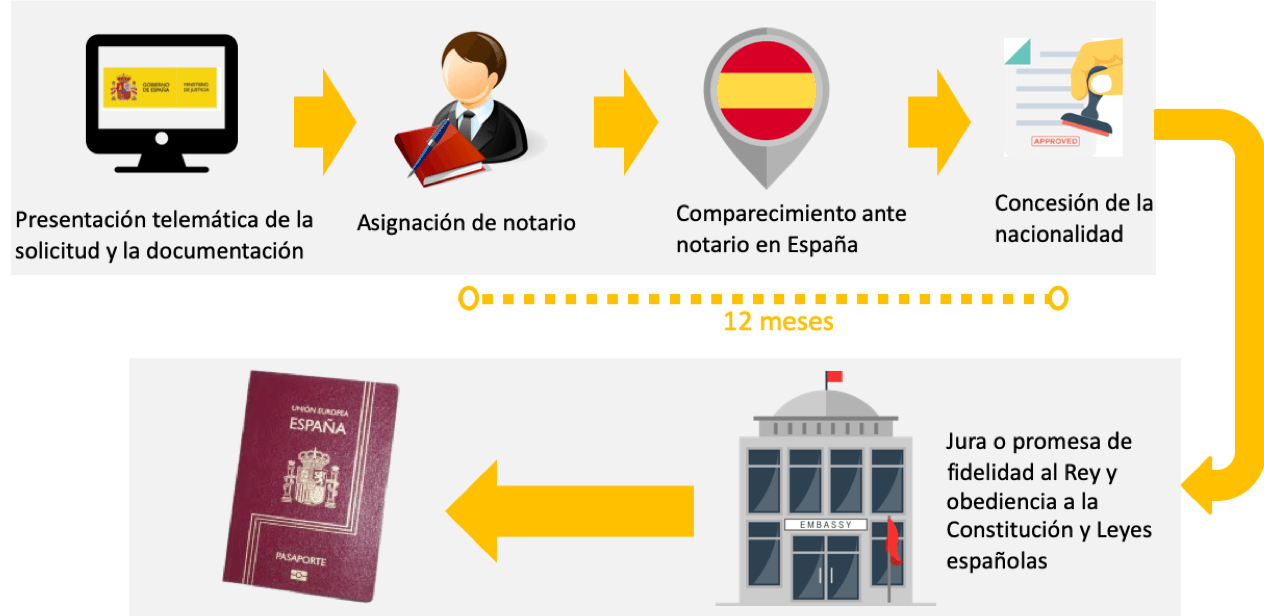 1. Electronic submission of the application2. Compilation and submission of the necessary documentation to the platform3. Selection of notary4. Sign in Spain before a notary presenting the original documentation5. Granting of nationality notified by the corresponding consulate6. Oath or promise7. Obtaining a Spanish passport